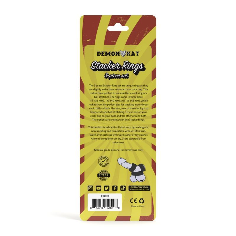 The 3-piece Stacker Rings set is unique as they are slightly wider than a standard size cock ring. This makes them perfect to use as either a cock ring or a ball stretcher.